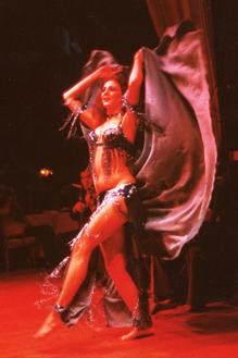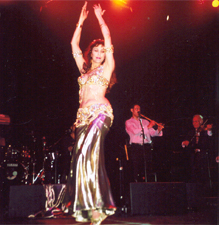 Asmahan began her professional danceing career at the Greek Taverna in San Francisco. Working for one year with a four piece Greek band was a good begining experience. This was a lovely family resturant and perfect to learn to dance in front of an audience. The next job opportunity came to dance at The Casbah with Fadil Shahin who was a superb singer and oud player. Jallal Takesh played kanoon with Salah Takesh on tabla. Other musicians accompanied on violin or nai with the dancers playing def. Some of the other dancers at this time were Rhea, Aida, Selwa, Raina, Safia, and an Iraqi called Princess Samia. Asmahan continued her training with Jamila and studied drum with the tabla player at the Bagdad, to learn the intricate drum rhythms. The music was fantastic. She played the def on stage with the band.