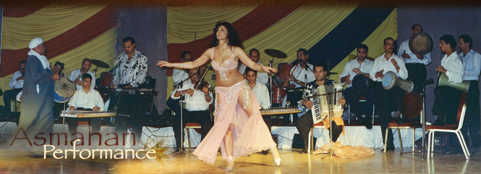 Over the next few years Asmahan produced a film in Cairo and London, making all the costumes, having music recorded, scouting locations, organizing props, and co-ordinating all the aspects of the project. It was a personal project made on a modest budget with everything done very resourcefully. It took several years to complete and was shelved for years until the post production money could be found. She designed and made costumes for other dancers and movie stars. The most famous movie star in the Middle East, Nabila Ebeid, had seen her photos at the studio of Bastet. She asked to be introduced and ordered costumes for her upcoming film: Al Raqassa wal Slyassi, where she played the role of a dancer. While in Cairo working on the costumes for Nabila, Asmahan was asked to dance at the Ramses Hilton Hotel. She signed a contract and began producing a show for the summer season. She was training with Madame Raqia Hassan who choreographed her show. The music by Mohammed Salem was used for the magencie. Mohammed Abdel Wahab had just written Mein Ghere Lei, and it was included in the show. The sword dance was of course for the finale. Asmahan made the costumes and Samasen helped as creative consultant. The musicians included: Said Saudi on tabla, Said Askar on accordian, Mohsen Chairi on nai, Amar Abdel Salem on organ, and Hassan Ein on mismar. The band leader was Hamada Abou Zara and Safaa Farid was the singer. The show was very successful, the other artists in the show were Alla Abdel Khallek and Hendia. Now the hotels had booked singers into the five star hotel shows, there were no show ballets. The singers brought a different atmosphere into the shows, and people danced on the stage like they did in night clubs. The year was 1990 and in August Saddam Hussein invaded Kuwait. Business was not affected and Cairo was very exciting, with George Bush coming for diplomatic talks and then every Arab leader. But finally a few days before the Jan 15th deadline for war to start, Asmahan left. The Gulf War had begun.